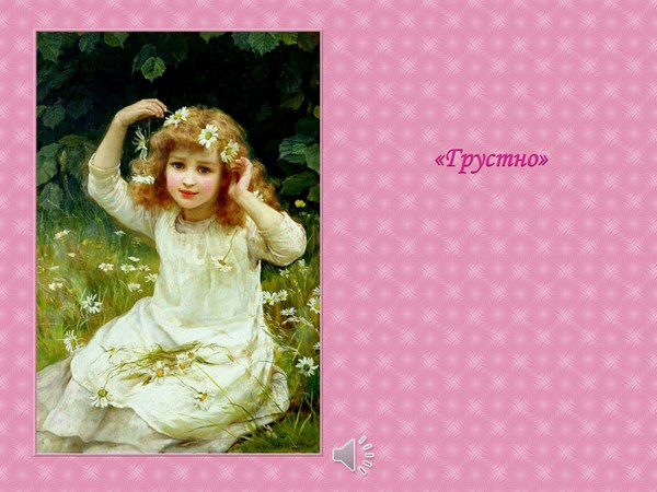 Одно и то же чувство (нежность) может быть окрашено весёлым или грустным настроением. Так бывает и в жизни: мама всегда ласково, нежно приласкает, и когда тебе весело, и когда грустно. Сейчас я дам каждому из вас по две карточки розового, нежного цвета, но на одной нарисована улыбающаяся девочка, а на другой - грустная. Когда вы услышите музыку нежную и весёлую, вы поднимете первую карточку, а когда нежную и грустную - вторую. (Дети выполняют задание.)