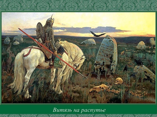 Теперь победители-богатыри красуются в Третьяковской галерее в Москве - в том же порядке, в каком явились когда-то Васнецову. В центре Илья Муромец, принципиальный и суровый. Не берёт он за свои подвиги подарков - ни «золотой казны несметной», ни «сёл с присёлками», ни «городов с пригородками»; бескорыстно защищает Русскую землю. И не скажешь, глядя на него, что первые тридцать лет и три года своей жизни провёл он на печи, болея, пока странники-волшебники не вылечили его и не дали силу богатырскую. Слева - Добрыня Никитич, благородный и дипломатичный. Помимо воинского, он славится в былинах и другими талантами: Добрыня - отличный шахматист и мастер играть на гуслях. Правда, гусли Васнецов отдал Алёше Поповичу, жизнелюбу и сердцееду, - наверное, чтоб не скучал на богатырской заставе.