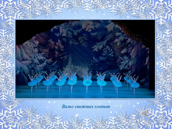 В балете «Щелкунчик» тоже есть вальсы. Мы сравним три вальса. Первый называется «Вальс снежных хлопьев». Он звучит в балете, когда принц пригласил Мари посетить его сказочное королевство. Они отправились в путь, и попали в зимний, заснеженный лес. Как звучит «Вальс снежных хлопьев»? (Дети слушают запись.)