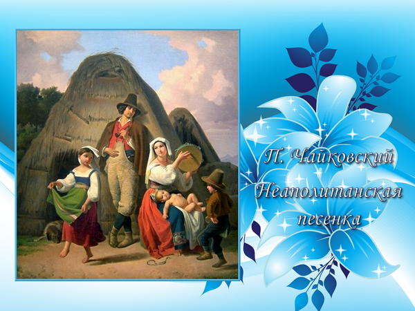 П. Чайковский много путешествовал и свои впечатления отражал в музыке. Так, в альбом вошли песни и танцы различных стран - итальянская, французская, немецкая песенки, чешская «Полька», польская «Мазурка». Сегодня вы услышите одну из этих пьес - «Неаполитанскую песенку». Неаполь - это город в Италии. В своей пьесе П. Чайковский очень выразительно передал черты итальянской народной музыки, звучание народных инструментов. Послушайте ее и скажите, какие настроения, чувства передаёт эта музыка (исполняет пьесу).
