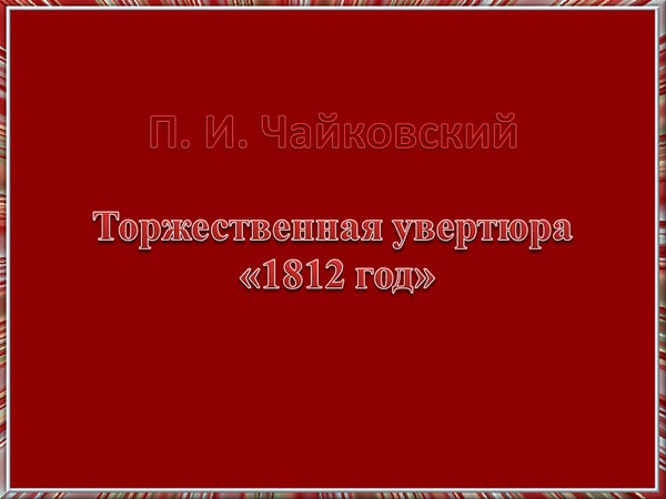 Торжественная увертюра «1812 год» (1880 г.) принадлежит к особому роду произведений, предназначенных для исполнения в больших помещениях или на открытом воздухе. Это монументальная, программная пьеса написана для исполнения большим составом симфонического оркестра с прибавлением группы ударных, больших колоколов и подвешенного барабана, употребляемого в оперных оркестрах для изображения пушечных выстрелов, а также группы инструментов военного оркестра (по желанию).