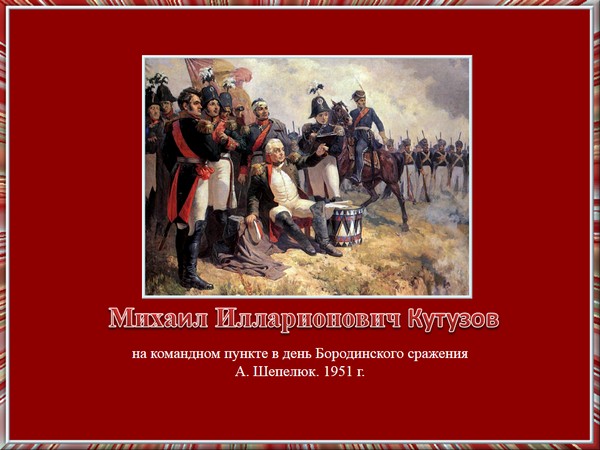 Увертюра описывает вторжение армии Наполеона в Россию и сражение при деревне Бородино под Можайском. В страшной битве обе стороны – и русские, и французы – понесли огромные потери, тем не менее, Наполеону удалось занять Москву. Однако, благодаря храбрости русских войск, великий полководец вынужден был отступить и с позором покинуть Россию.