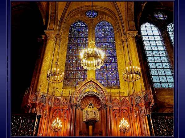 Собрание витражей кафедрального собора в Шартре называют стеклянной библией. Каждый витраж представляет собой эпизод из Библии или картину из французской жизни XIII века. «Читать» их нужно слева направо, но не так, как книги, а снизу-вверх, то есть от земли к небу.