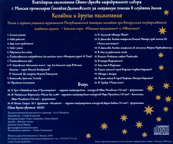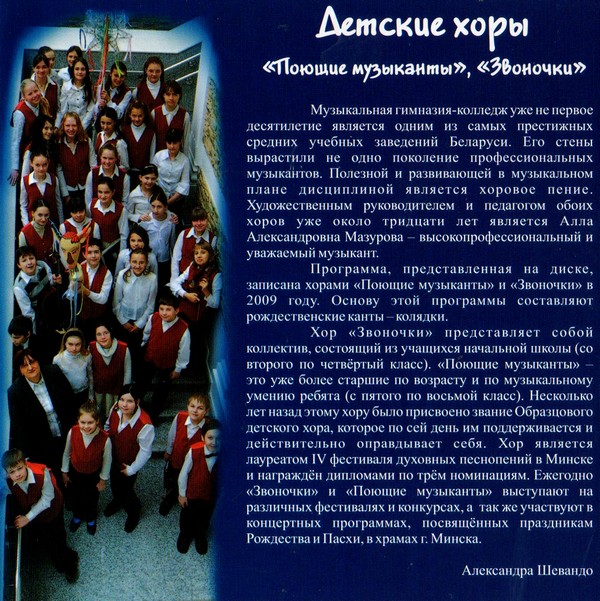 Альбом рождественских кантов - колядок в исполнении детских хоров «Поющие музыканты» и «Звоночки» музыкальной гимназии-колледжа г. Минска.