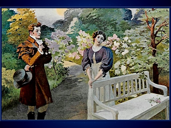 Ольга и Ленский - счастливы. Порывистая лирическая мелодия ариозо Ленского «Я люблю вас, я люблю вас, Ольга» передаёт восторженную влюблённость юного поэта.