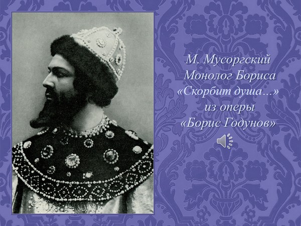 Слушание: М. Мусоргский. Монолог Бориса (пролог) «Скорбит душа…» из оперы «Борис Годунов», в исполнении Ф. Шаляпина.