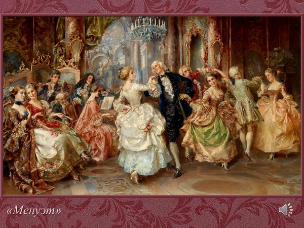 Менуэт - старинный танец французского происхождения. Слово менуэт произошло от французского слова menu, что означает «маленький, мелкий». Три столетия назад и позже менуэт был очень популярен в разных странах. В России его танцевали при дворе царя Петра I. Этот танец танцуют маленькими, мелкими шажками в умеренном темпе, плавно, церемонно, с поклонами и приседаниями. Это старинный танец, сдержанный, церемонный, галантный.