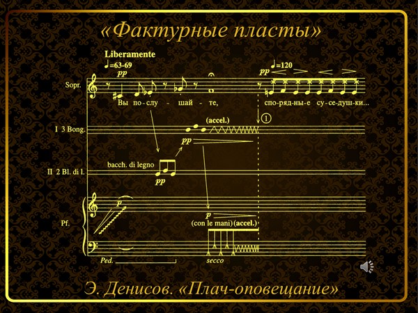 «Музыкальная ткань», «узор», «орнамент», «контур», «фактурные пласты», «фактурные этажи» - эти образные определения указывают на зрительность, живописность, пространственность фактуры.