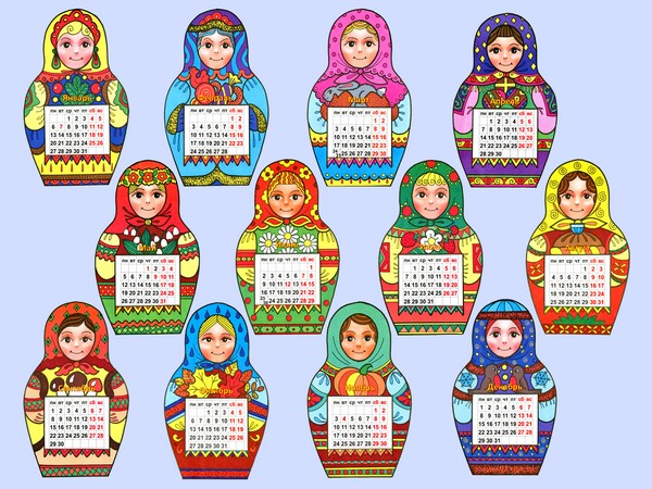 Оригинальные красочные календари-закладки «Матрёшки» отдельно на каждый месяц 2014-го года. Рекомендуем распечатать на плотной матовой фотобумаге 2 или 4 закладки-«матрёшки» на один лист A4 и вырезать по контуру.