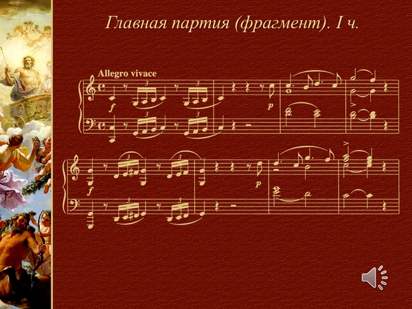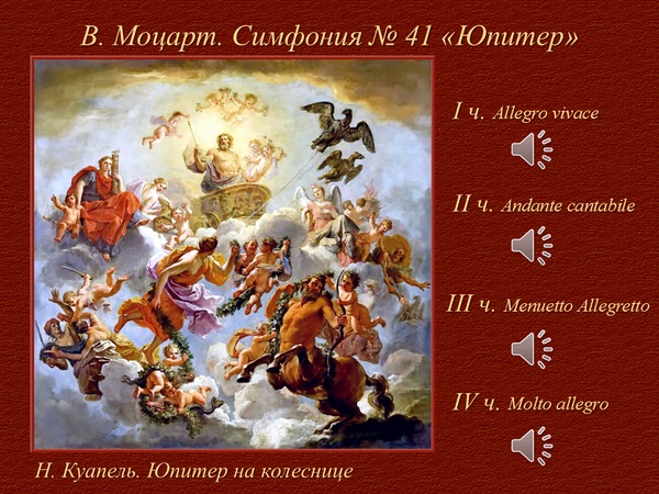 - Строение симфонического цикла. Музыкальная тема как главный носитель идеи, мысли, содержания произведения. Знакомство с формой сонатного аллегро. Реализация сонатной формы в финале Симфонии № 41 В. А. Моцарта;