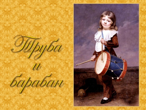П е д а г о г. Оба инструмента - труба и барабан – очень древние. Труба - медный духовой инструмент. В древности она представляла собой прямую трубку, расширяющуюся на одном конце. Ее использовали пастухи, охотники, воины для подачи сигнала.