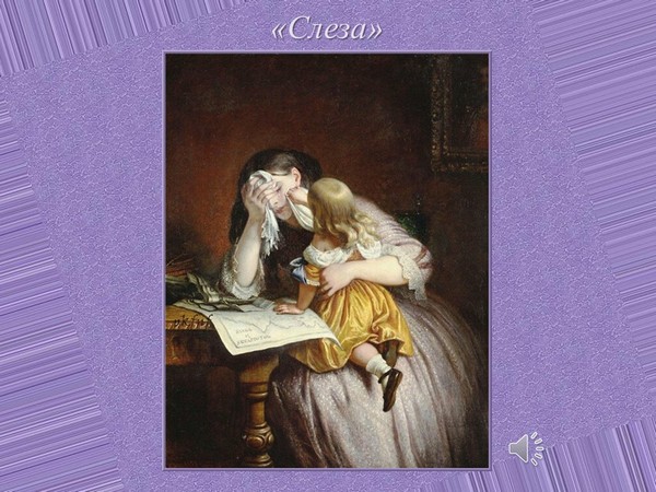 Сейчас послушайте ещё одну пьесу, в которой, как ясно уже из названия, тоже выражено грустное настроение. Она называется «Слеза». Написал её великий русский композитор Модест Петрович Мусоргский. Грусть бывает разная. Какие настроения выражены в этой пьесе? (Исполняет её.)