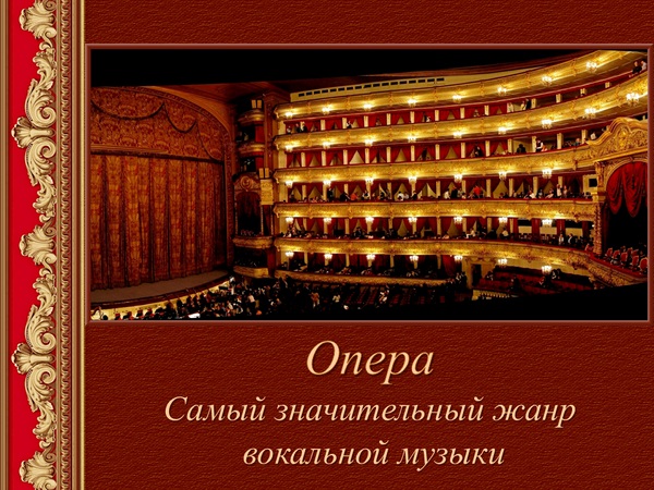 - Не правда ли, ребята, когда попадаешь в огромный, сверкающий огнями зал оперного театра, чувствуешь себя словно окрылённым радостью! Сегодня на уроке мы будем говорить об опере.