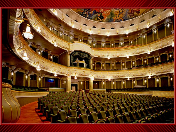 Второй – великолепный зрительный зал: обитые бархатом кресла, позолота и барельефы, скульптуры и драпировки.