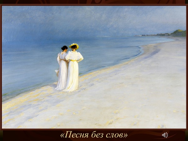 Послушайте одну из пьес этого замечательного цикла – Песню без слов № 14. Её музыка необыкновенно мелодична, певуча, отличается широким дыханием. Её так и хочется запеть. А ведь это чисто инструментальное произведение. Наверное, благодаря такой певучей мелодии эта пьеса и получила своё название «Песня без слов».