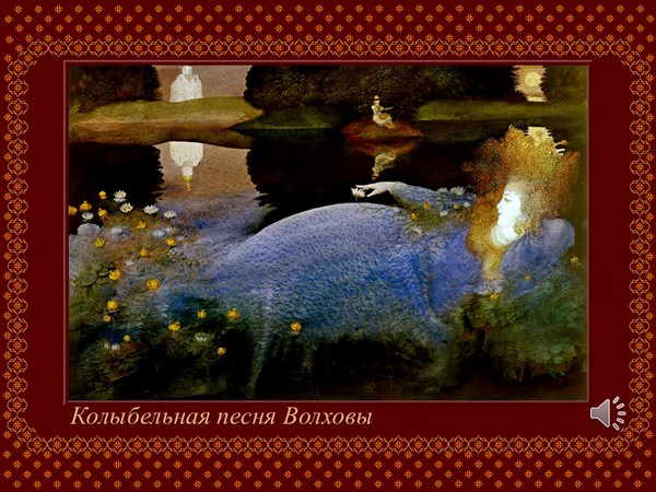 Слушание: Колыбельная песня Волховы. Снова берег Ильмень-озера. Спит Садко. Нежно баюкает его Волхова, прощается морская царевна с красивым молодцем. С первыми лучами утренней зари рассеется по зелёному лугу алым туманом сказочная царевна, превратится в широкую реку Волхову. По Волхове-реке приплывут в Великий Новгород корабли Садко.