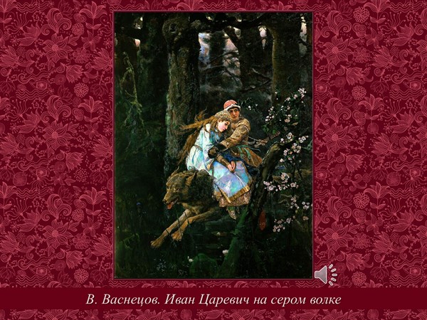 Брат Виктора Васнецова, Аполлинарий, тоже художник, вспоминал, что недалеко от села Рябова, где они выросли, оставались «древние леса», где «поражали великаны-ели, поваленные буреломом, мягкие подушки мха и пни обхвата в два». Там и волки должны водиться такие, как в сказке говорится, - «пребольшие», чтоб на спине свободно помещались царевич и царевна.