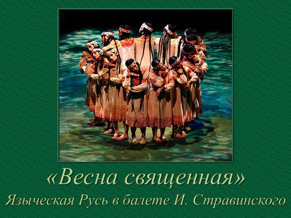 «Весна священная» - образ языческой Руси с её весенними гаданиями, девичьими хороводами, культом Земли, жертвоприношением в честь богини Весны. В балете необыкновенно сильна и выразительна могучая стихия ритма - этого первоначала музыки, восходящего к глубинным свойствам человеческой природы...